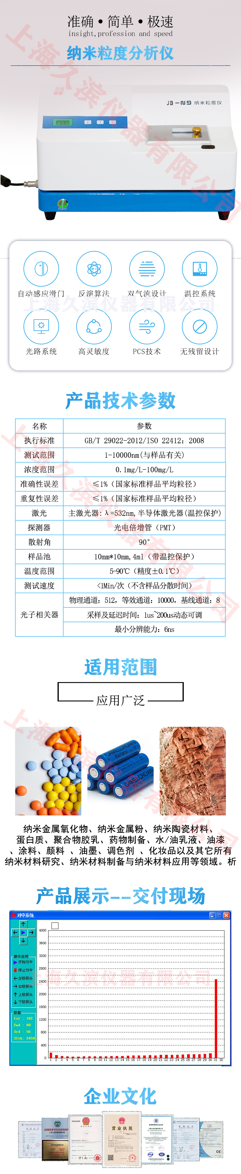 JB-N9是我公司新推出的基于動態(tài)光散射原理的納米粒度儀。它采用高速數(shù)字相關器和專業(yè)的高性能光電倍增管作為核心器件,具有快速、高分辨率、重復及準確等特點,是納米顆粒粒度測定的首選產(chǎn)品。