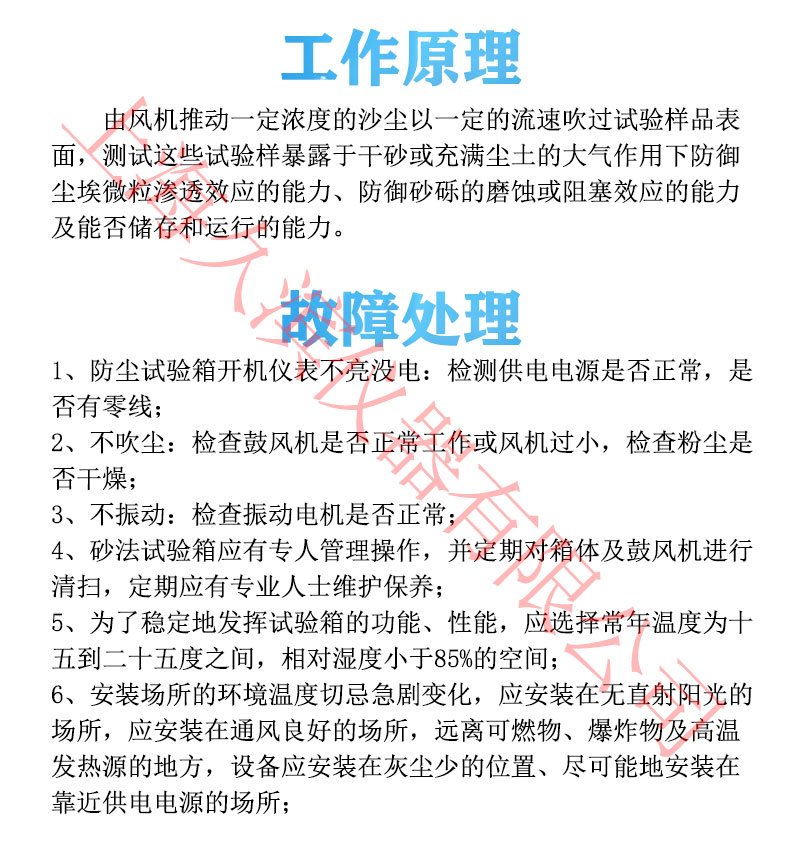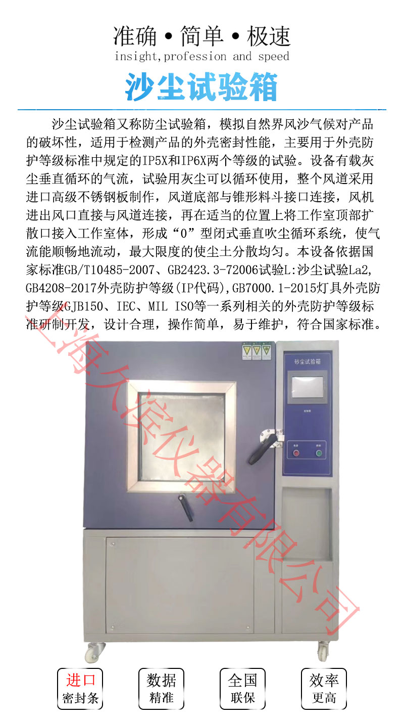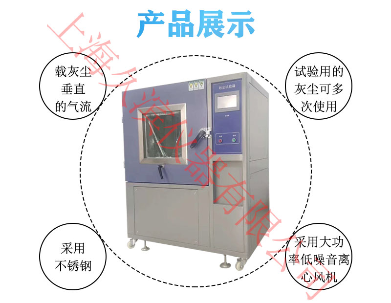 沙塵試驗箱模擬自然界風沙氣候對產品的破壞性,適用性檢測產品的外殼密封性能,主要有于外殼防護等級標準中規(guī)定的IP5X和IP6X兩個等級的試驗。設備有載灰塵垂直循環(huán)的氣流,試驗用灰塵可以循環(huán)使用,整個風道采用進口高級不銹鋼板制作,風道底部與錐形料斗接口連接,風機進出風口直接與風道連接,再在適當?shù)奈恢蒙蠈⒐ぷ魇翼敳繑U散口接入工作室體,形成“O”型閉式垂直吹塵循環(huán)系統(tǒng),使氣流能順暢地流動,*大限度的使塵土分散均勻。
