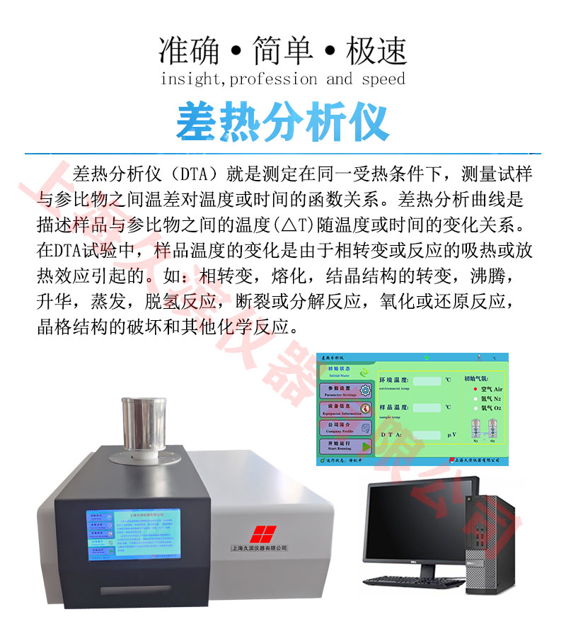 差熱分析是在程序控制溫度下,測量物質(zhì)與參比物之間的溫度差與溫度關(guān)系的一種技術(shù)。差熱分析曲線是描述樣品與參比物之間的溫度(△T)隨溫度或時間的變化關(guān)系。在DTA試驗中,樣品溫度的變化是由于相轉(zhuǎn)變或反應(yīng)的吸熱或放熱效應(yīng)引起的。如:相轉(zhuǎn)變,熔化,結(jié)晶結(jié)構(gòu)的轉(zhuǎn)變,沸騰,升華,蒸發(fā),脫氫反應(yīng),斷裂或分解反應(yīng),氧化或還原反應(yīng),晶格結(jié)構(gòu)的破壞和其他化學(xué)反應(yīng)。