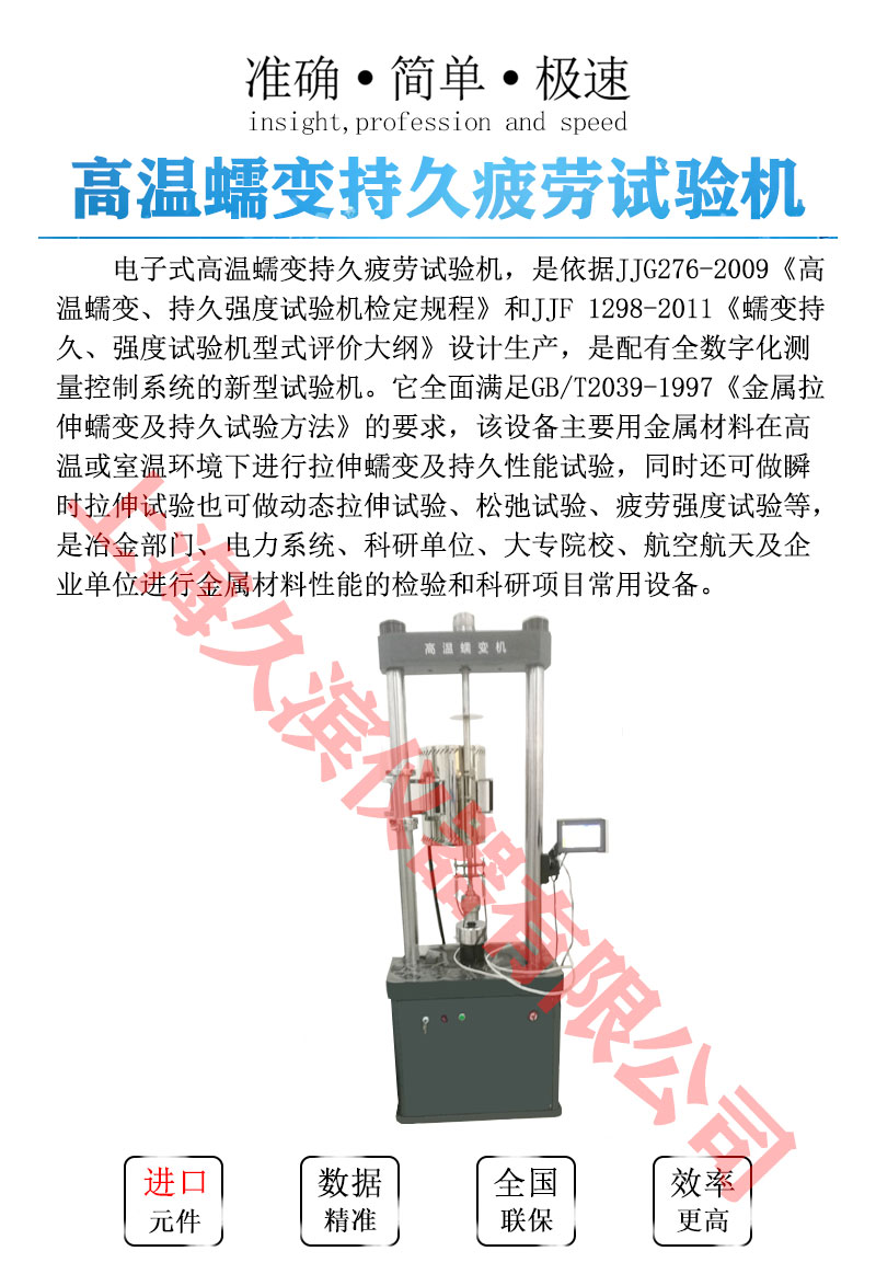 電子式蠕變及持久強(qiáng)度試驗(yàn)機(jī), 是依據(jù)JJG276-2009 《高溫蠕變、持久強(qiáng)度試驗(yàn)機(jī)檢定規(guī)程》和JJF 1298-2011《蠕變持久、強(qiáng)度試驗(yàn)機(jī)型式評(píng)價(jià)大綱》設(shè)計(jì)生產(chǎn),是配有全數(shù)字化測(cè)量控制系統(tǒng)的試驗(yàn)機(jī)。它全面滿足GB/T2039-1997《金屬拉伸蠕變及持久試驗(yàn)方法》的要求,該設(shè)備主要用金屬材料在高溫或室溫環(huán)境下進(jìn)行拉伸蠕變及持久性能試驗(yàn),同時(shí)還可做瞬時(shí)拉伸試驗(yàn)也可做動(dòng)態(tài)拉伸試驗(yàn)、松弛試驗(yàn)、疲勞強(qiáng)度試驗(yàn)等,是冶金部門、電力系統(tǒng)、科研單位、大專院校、航空航天及企業(yè)單位進(jìn)行金屬材料性能的檢驗(yàn)和科研項(xiàng)目常用設(shè)備。